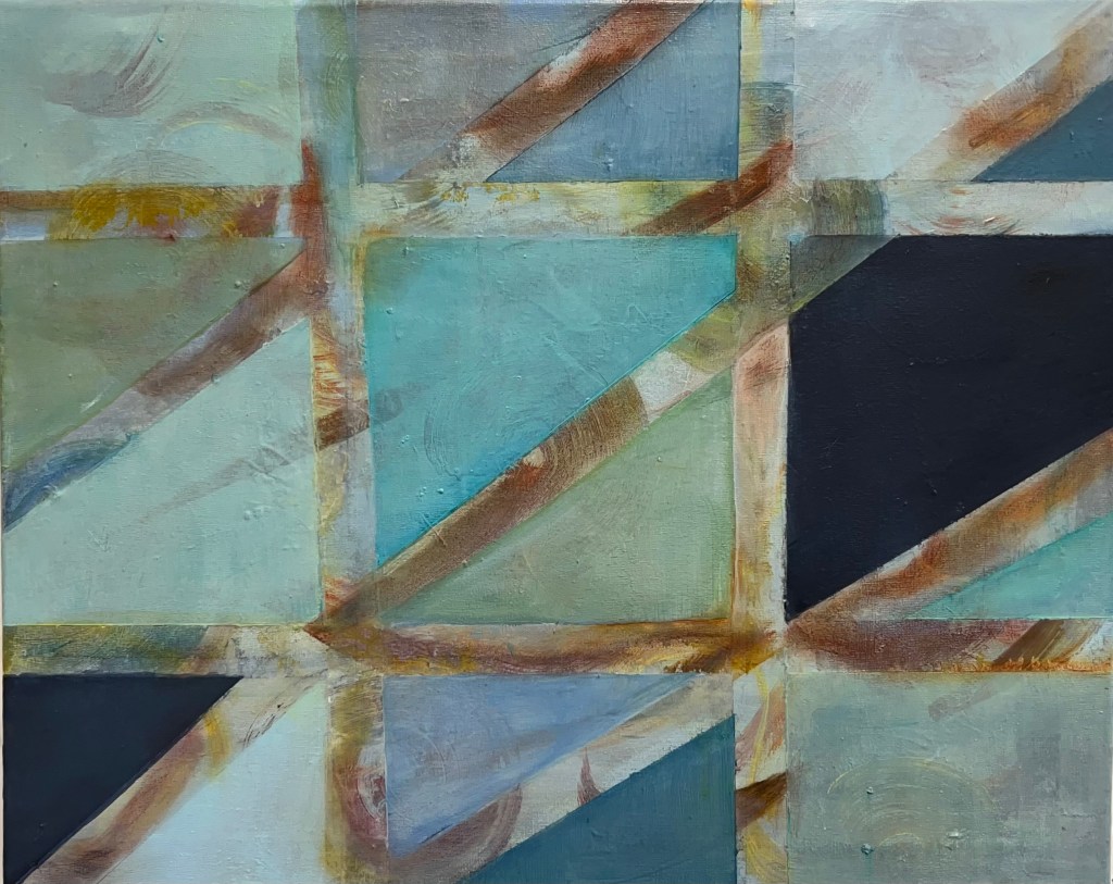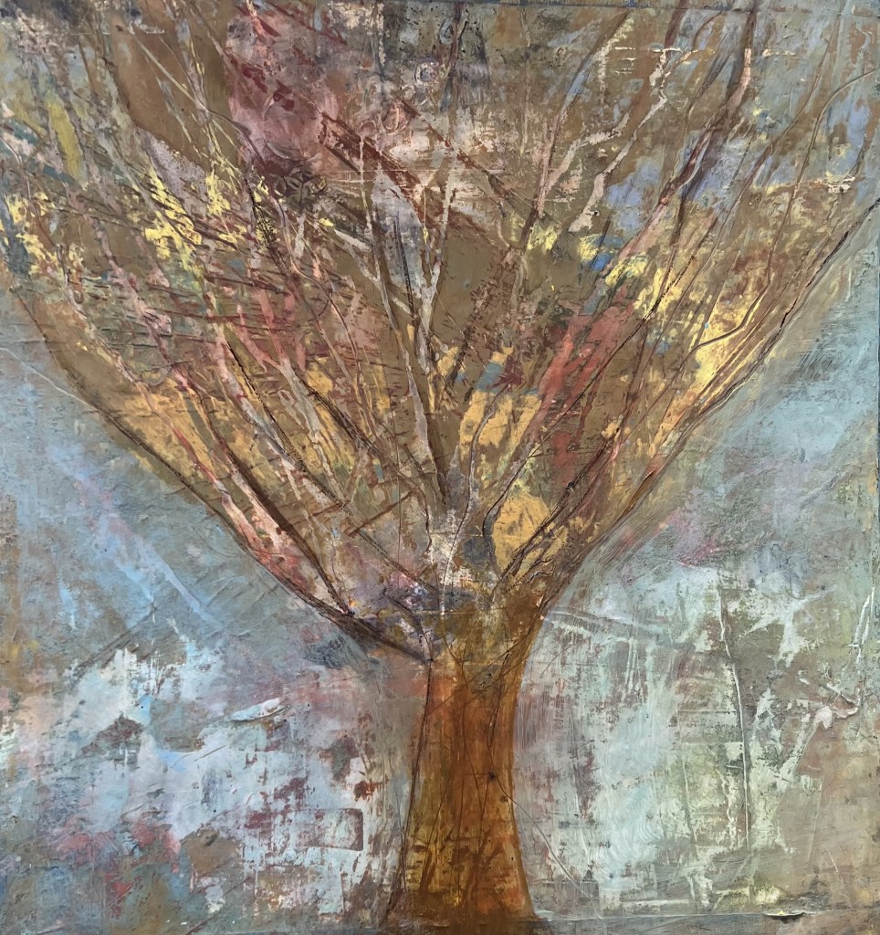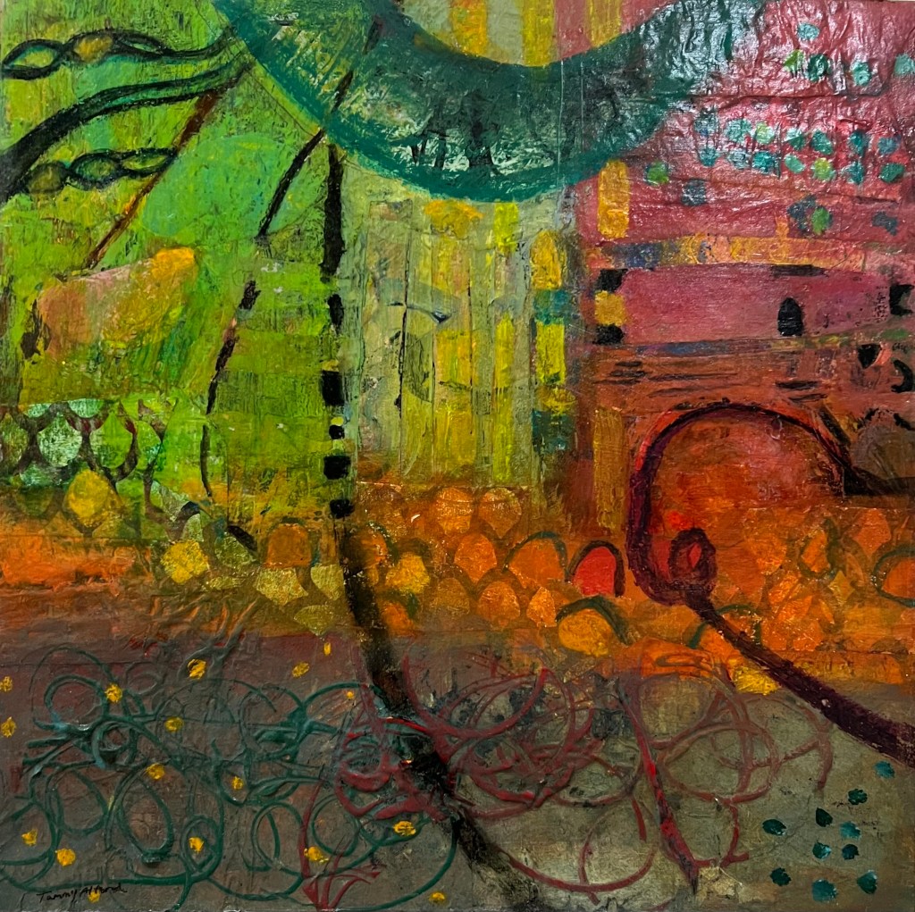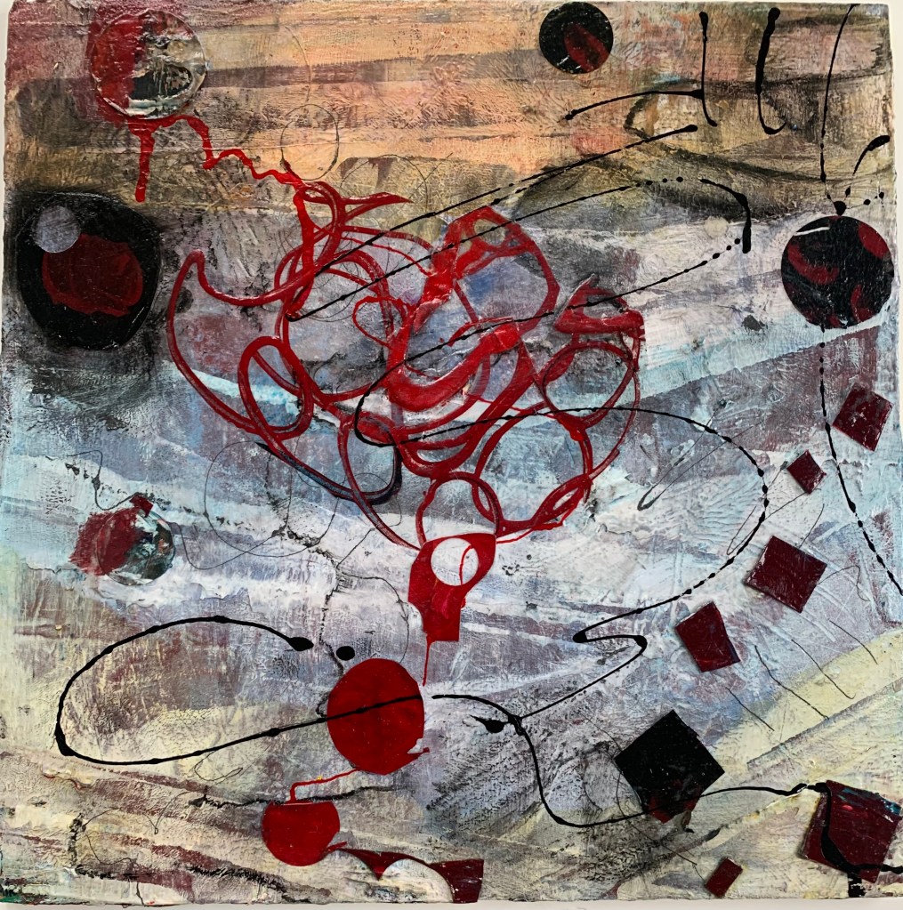 Acrylic mixed media with collage elements on 12×12 wood panel.
