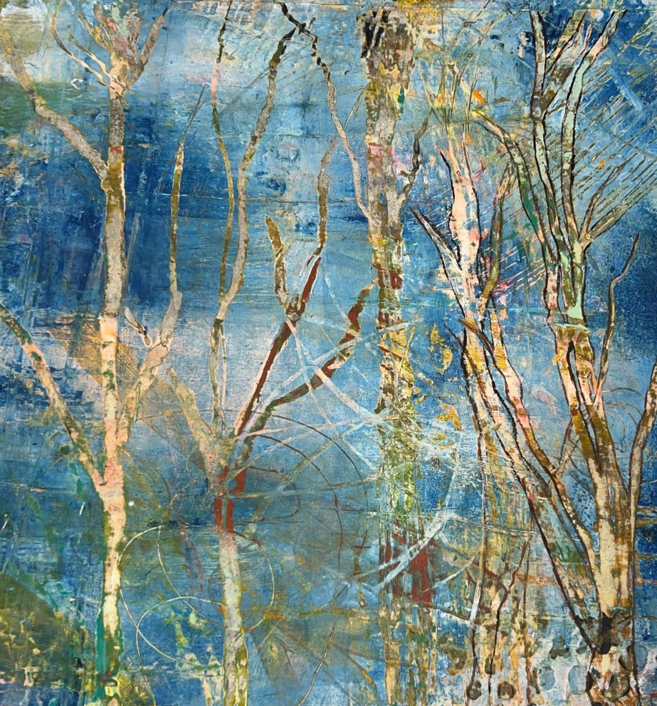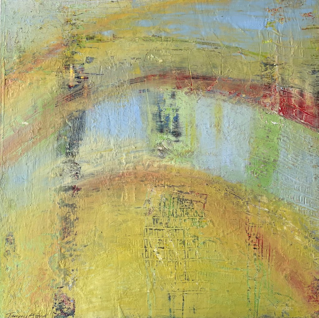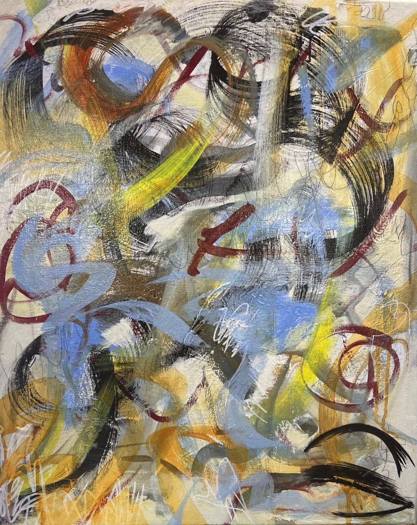 Fall colors are my favorite palette. The under layers of this painting show hints of summer flowers and plants that have given place to autumn. Fall can be a windy time in Kansas, so I tried to capture that sensation in the swirls and energy.